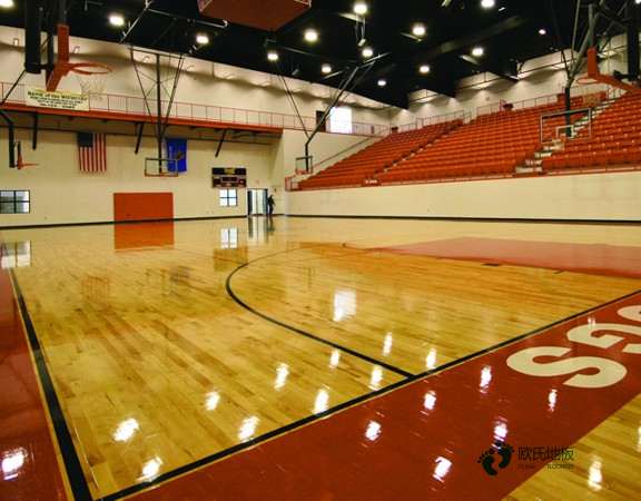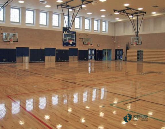 通常的橡膠、PU、PVC、再生橡膠等不同種類都是可選擇范圍。承載層通常有單龍骨或雙龍骨兩種做法可以選擇,在此過程中需要注意做好防腐處理,通常選擇是使用防腐劑。400mm是龍骨間一般情況下設置的距離。根據龍骨與地面的處理方式可以把體育木地板的存在劃分為懸浮式系統、固定式系統和固定懸浮式系統。懸浮式系統是龍骨與地面不連接,固定式系統和固定懸浮式系統是龍骨與地面連接方式不同的劃分。穩定層是體育木地板的較上層。它對板材的基本要求通常是采用大幅面的材料,可選擇地范圍通常為OSB板或者是膠合板,通常來說它的厚度需要在12mm以上,而它的大小尺寸基本1.22*2.44m。歐氏實木運動地板是中國體育實木運動地板行業的民族品牌。